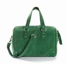 Ευρύχωρη τσάντα σε εντυπωσιακό πράσινο χρώμα. Φόρεσε την σε μία απογευματινή βόλτα με μία μπεζ ολόσωμη φόρμα και μωβ ψηλοτάκουνα ankle boots.